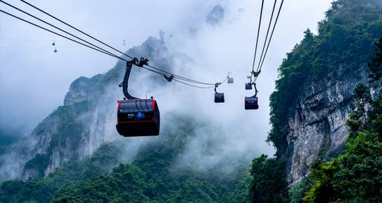 天門山山頂森林觀光纜車,纜車以天門山主峰云夢仙頂為起點(diǎn),以天門山寺前櫻桃灣廣場為終點(diǎn),總長度為800米,單程運(yùn)行約10分鐘,為無遮蓋的雙人吊椅式,每小時運(yùn)力可達(dá)600人。
