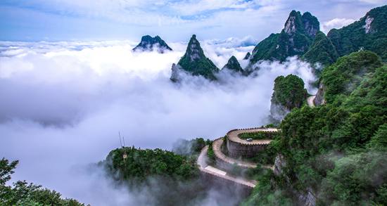 天門山盤山公路全長 10.77公里,高差 1300多米,共有99道彎,因直達(dá)天門洞而得名“通天大道”。大道兩側(cè)空谷幽深,借山勢層層疊起,如巨龍盤旋,直通天際,被譽(yù)稱為 “天下第一公路奇觀”。