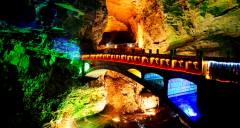 黃龍洞是張家界武陵源風(fēng)景名勝中著名的溶洞景點(diǎn),因享有“世界溶洞奇觀”“世界溶洞全能冠軍”“中國最美旅游溶洞”等頂級榮譽(yù)而名震全球?,F(xiàn)已探明洞底總面積10萬平方米;洞體共分四層,洞中有洞、洞中有山、山中有洞、洞中有河。經(jīng)中外地質(zhì)專家考察認(rèn)為:黃龍洞規(guī)模之大、內(nèi)容之全、景色之美,包含了溶洞學(xué)的所有內(nèi)容。黃龍洞以其龐大的立體結(jié)構(gòu)洞穴空間、豐富的溶洞景觀、水陸兼?zhèn)涞挠斡[觀光線路獨(dú)步天下。
