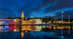 人類文明河,這里將世界上七處著名的景觀以微縮的方式匯集在河中,用長流不息的河水寓意人類文明的源遠流長。最近的一處景觀是法國四大洲噴泉,噴泉通過頂部歐、亞、非、美四位女性雕像和底部的駿馬、海豚表現(xiàn)了四大洲人民的團結向上和友誼,具有強烈的和平主義精神和時代感。從這里向遠處看,成白色貝殼狀的是澳大利亞悉尼歌劇院。緊挨著的是建在新加坡安德遜橋畔的魚尾獅,在魚尾獅旁邊的是美國自由女神像。在人類文明河的上游是埃及金子塔和其守護之神司芬克斯獅身人面像。河內(nèi)還有秘魯復活節(jié)島巨人頭像,面北朝南。