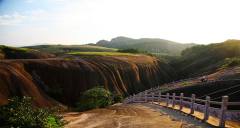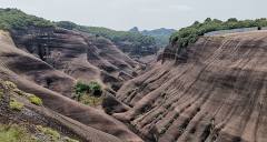 景區(qū)地質(zhì)構(gòu)造較復(fù)雜。區(qū)內(nèi)地貌類(lèi)型多樣,既有典型的丹霞地貌,又有喀斯特溶洞景觀(guān),公園集紅巖丹霞地貌,溶洞、碧水,溫泉于一體,更兼有古樸人物景觀(guān)之襯托。青山、綠水、紅崖赤壁、竹林深深,構(gòu)成一幅雄、奇、險(xiǎn)、秀,美輪美奐的自然畫(huà)卷。